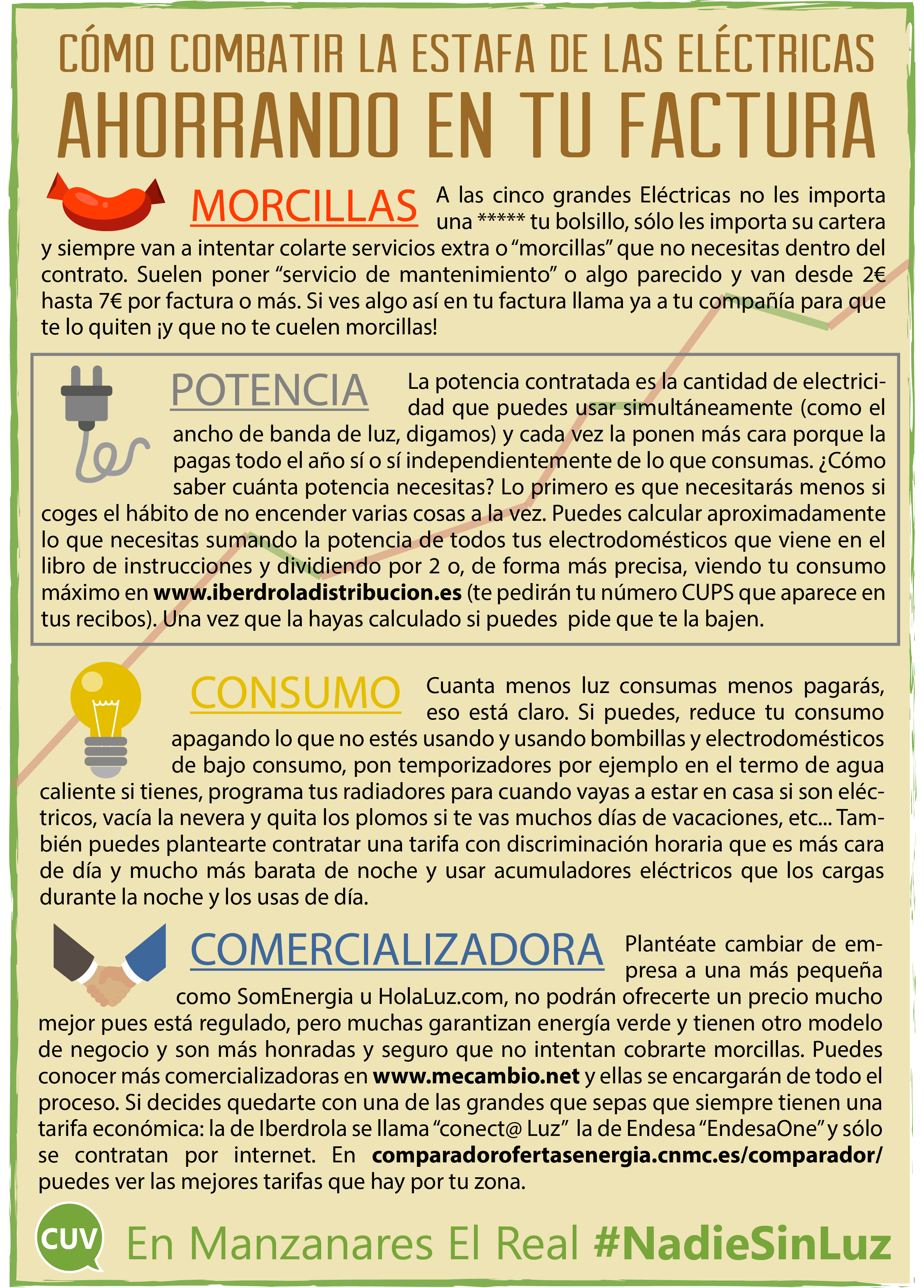 Compartimos hoy un pequeño resumen para tod@s aquellos que no pudisteis venir al taller del viernes sobre CONSUMO ENERGÉTICO Y LECTURA DE LA FACTURA DE LA LUZ. Este resumen es nuestro granito de arena de hoy para empezar a combatir la estafa de las eléctricas desde nuestros hogares ahorrando en la factura de la luz.