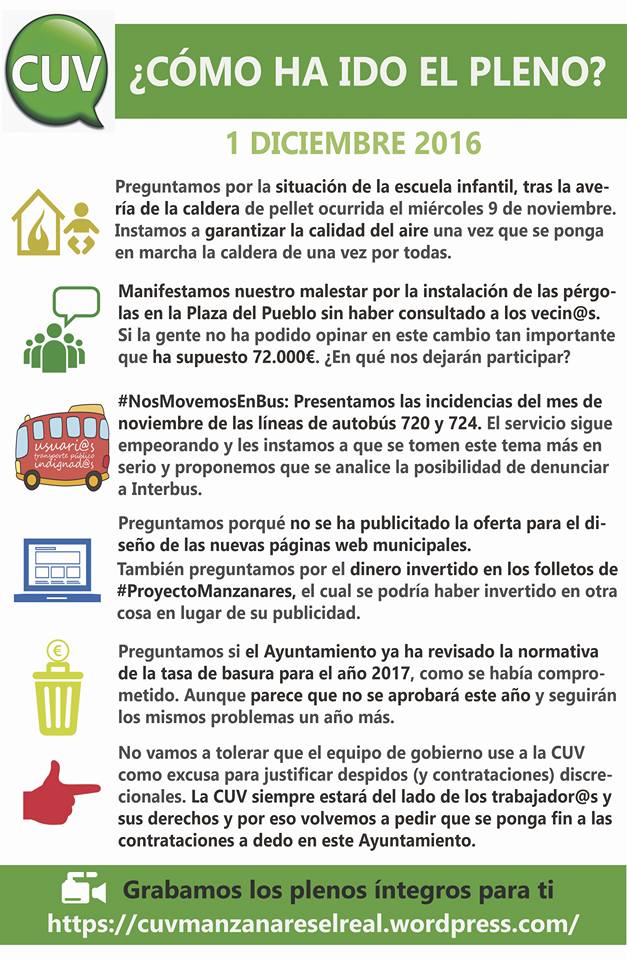 Plenos Municipales, Uncategorized¿Cómo ha ido el pleno este mes? – Diciembre 2016 2 diciembre, 20166 febrero, 2017 CUV Hola a tod@s! Porque nos importa mucho que estés informado de todo lo que pasa en nuestro pueblo, hemos preparado esta infografía con los puntos clave del último pleno municipal del 1 de diciembre. Comparte esto: Compartir en X (Se abre en una ventana nueva) X Comparte en Facebook (Se abre en una ventana nueva) Facebook Me gusta Cargando... Relacionado