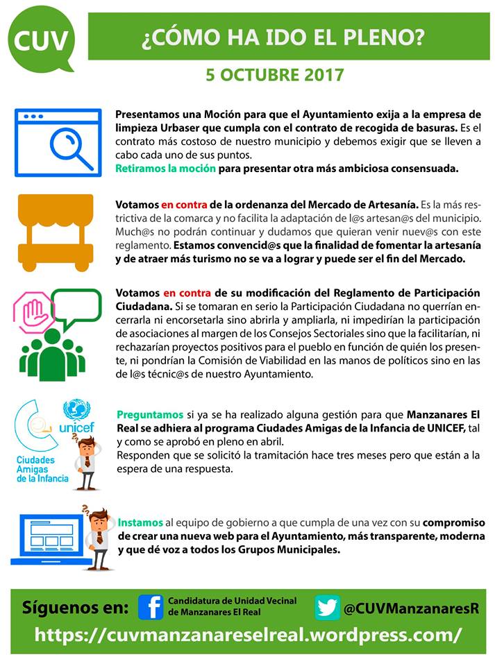 Plenos Municipales, Uncategorized¿Cómo ha ido el pleno de Octubre? 7 octubre, 20177 octubre, 2017 CUV Hola, manzanarieg@! ¿Quieres saber que pasó en el último pleno municipal? En esta infografía te lo contamos. Y si quieres profundizar, en este enlace puedes ver la grabación completa del pleno : https://www.youtube.com/watch?v=-atu3nqyrtQ Comparte esto: Compartir en X (Se abre en una ventana nueva) X Comparte en Facebook (Se abre en una ventana nueva) Facebook Me gusta Cargando... Relacionado