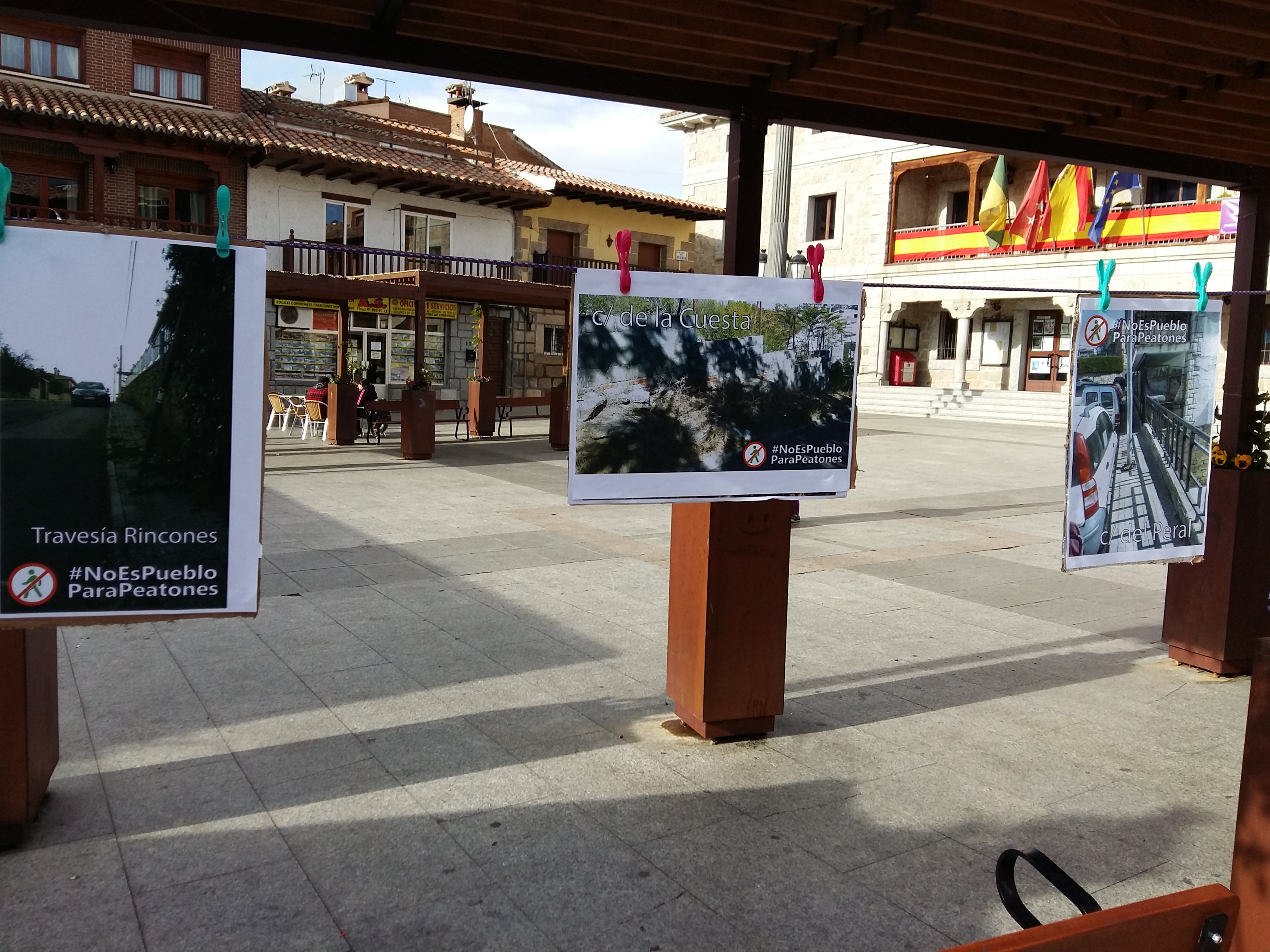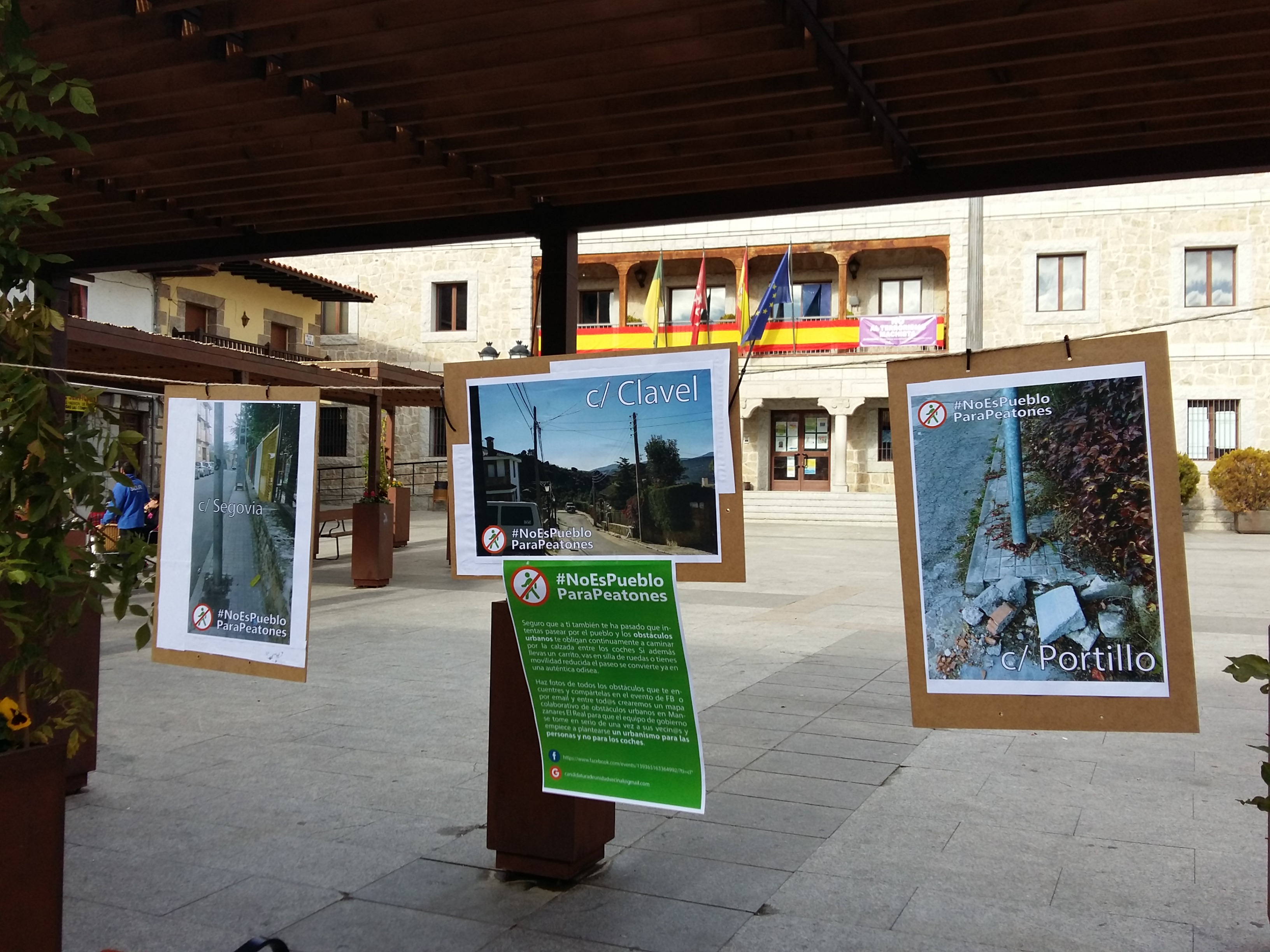 27 de noviembre de 2017.— La Candidatura de Unidad Vecinal de Manzanares El Real (CUV) ha expuesto el pasado sábado 25 de noviembre en la Plaza del Pueblo una muestra de las más de 200 fotografías que vecinos y vecinas han enviado a través de Facebook, y que reflejan las dificultades de transitar a los peatones, incluido el centro del municipio. Con el material recibido se ha elaborado un mapa colaborativo de obstáculos urbanos con sus correspondientes fotografías.