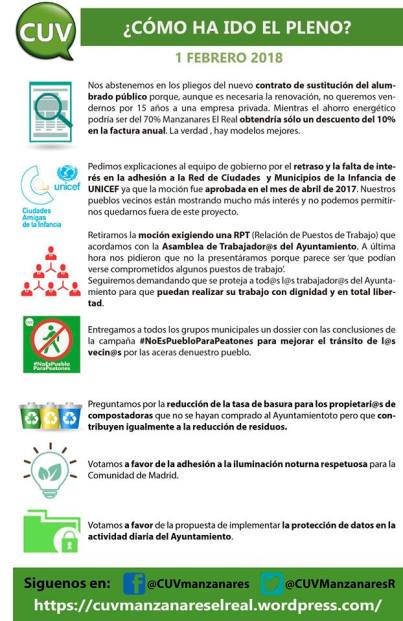 ¿Quieres saber que pasó en el último pleno municipal del 1 de Febrero de 2018? En esta infografía te lo contamos. Y si quieres profundizar, en este enlace puedes ver la grabación completa del pleno : https://youtu.be/CsqAwg9YnoM