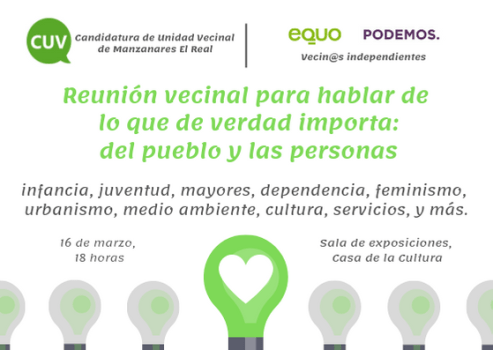 Te esperamos este sábado 16 de marzo a las 18h en la sala de exposiciones de la Casa de la Cultura para hablar de lo que de verdad importa: del pueblo y las personas. Si te interesa presentarte como candidato/a a nuestras primarias abiertas (30/31 de marzo) o si tienes ideas y propuestas para mejorar nuestro municipio en materia de medioambiente, cultura, deportes, feminismo, urbanismo, empleo, impuestos o de cualquier otra cosa, nos encantaría escucharte.