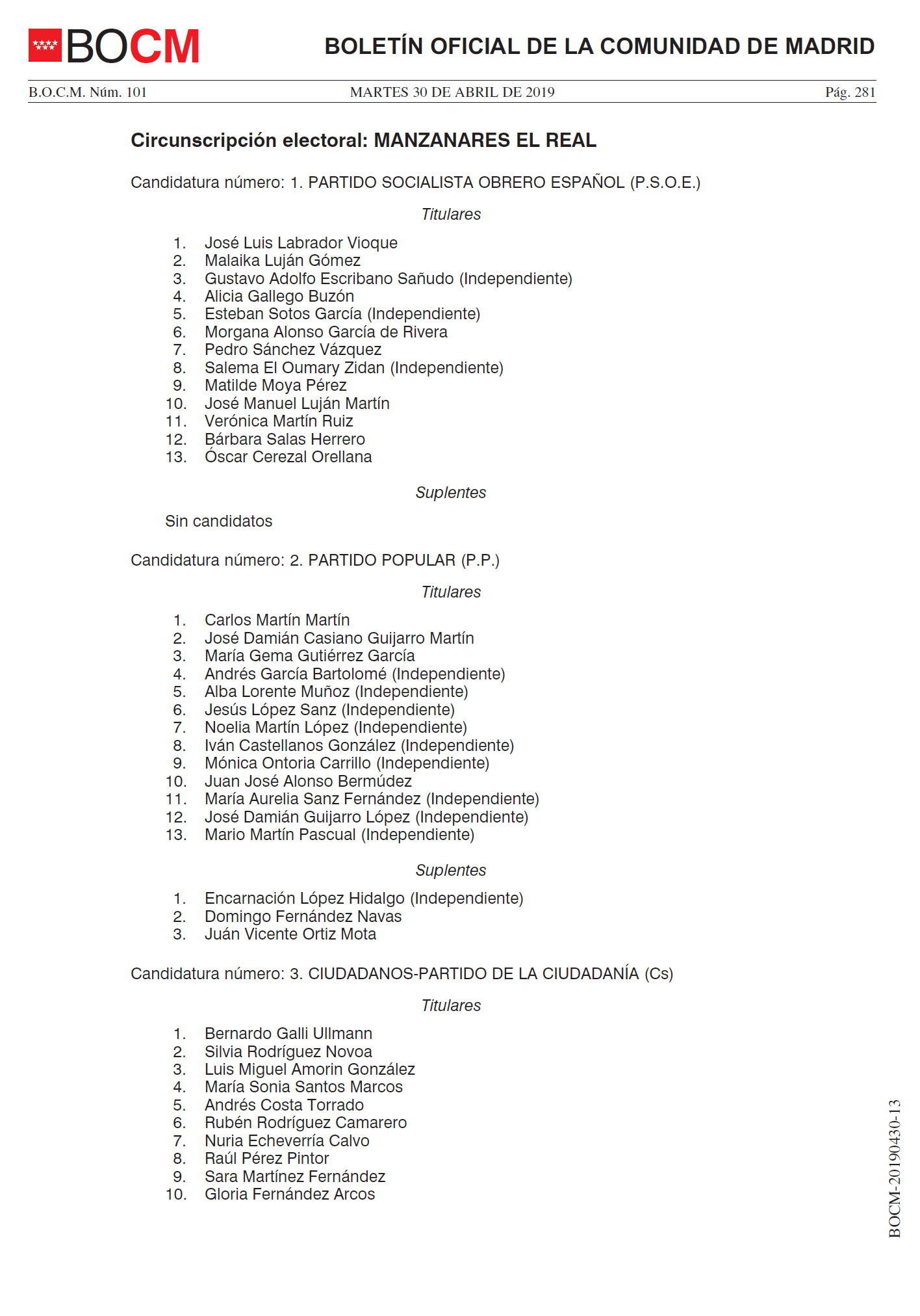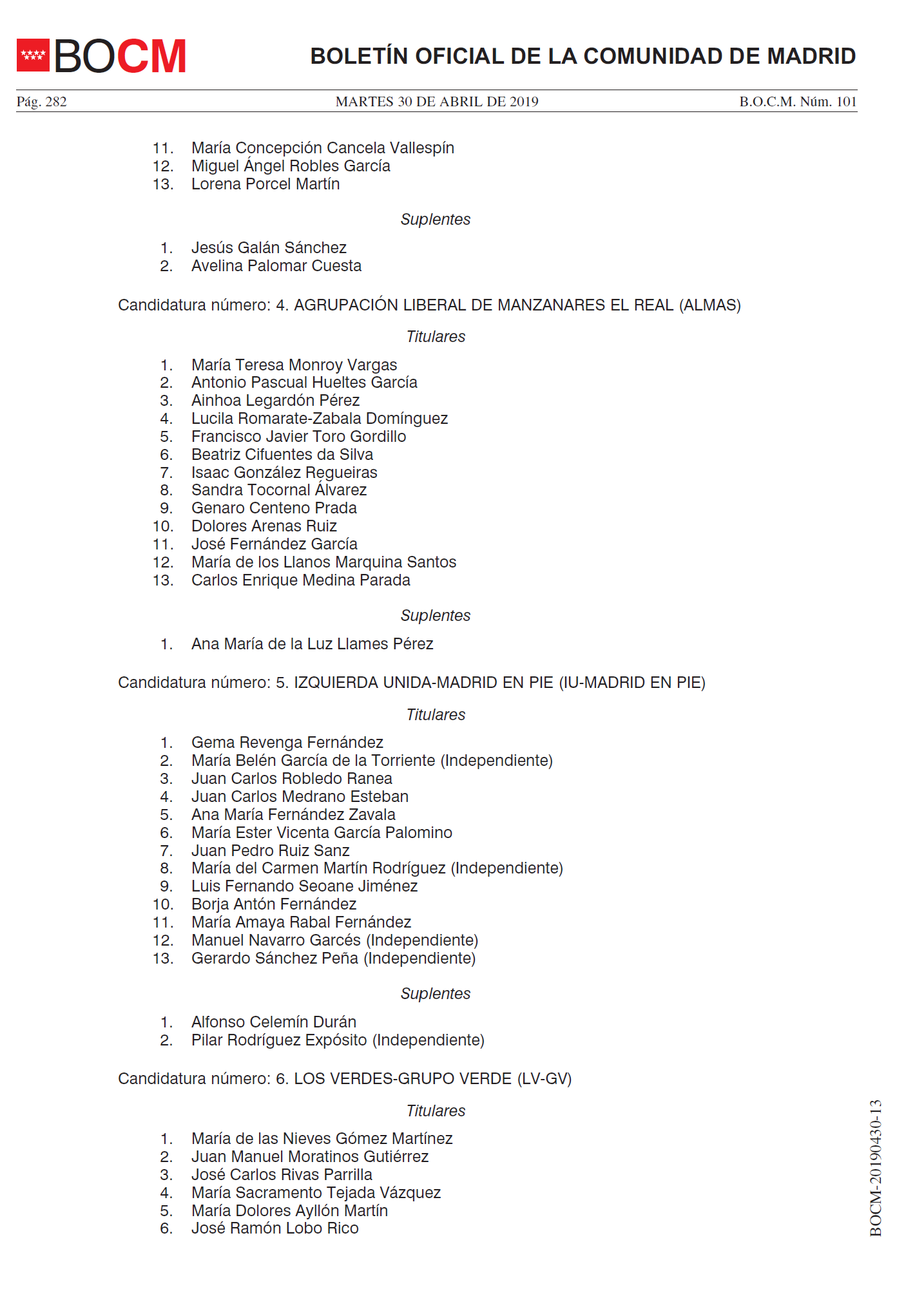 Hoy se ha publicado en el BOCM la proclamación de candidaturas a los comicios del 26 de mayo. En Manzanares el Real (página 52) se han registrado 8 candidaturas: PSOE, PP, Agrupación Liberal de Manzanares el Real (Almas), Vox, Izquierda Unida-Madrid en Pie, Los Verdes, C´s, y nuestra confluencia Podemos-Equo-Candidatura de Unidad Vecinal.